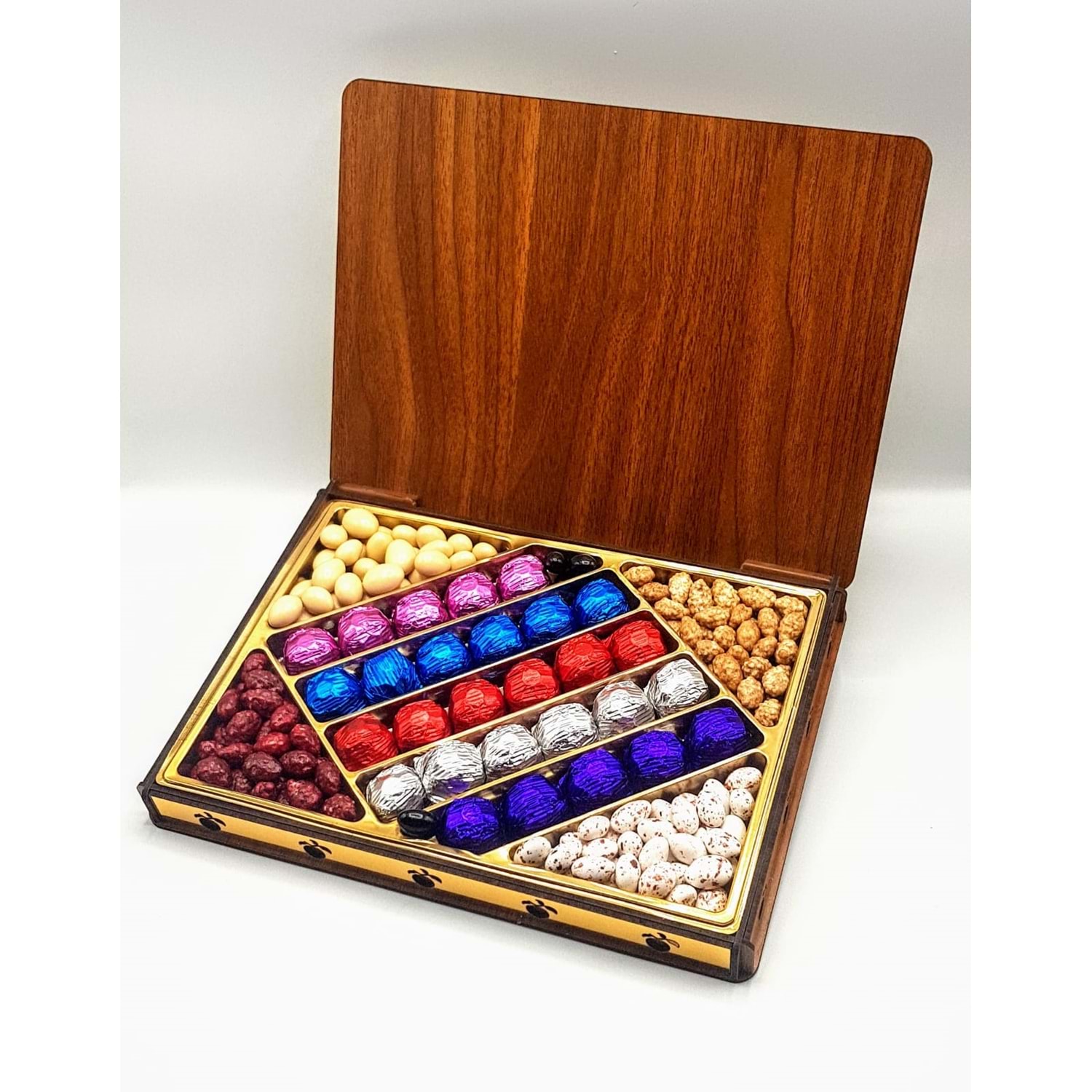 Enfes Belçika Çikolatalarımız ve Şekirdek Çeşitlerimizden Oluşan Gold İşlemeli Ahşap Kutu.